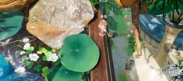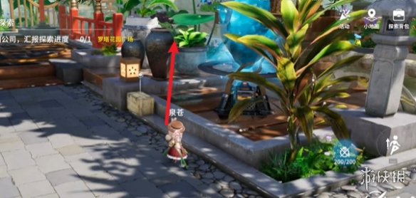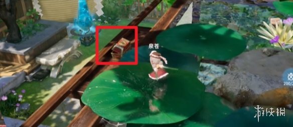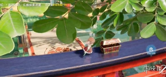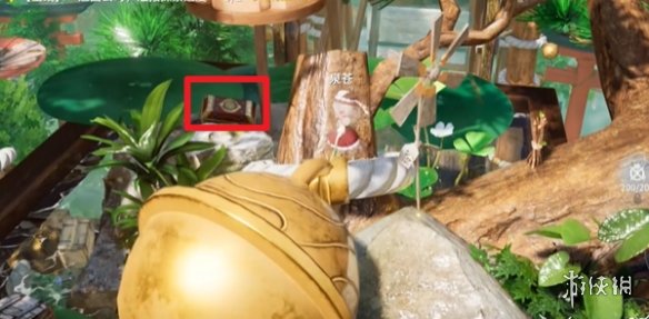 在菩提峰上找到指引的水晶并使用传送术前往花盆旁,转动视角即可发现藏有新月石的红箱子。