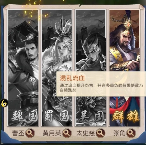 如果小伙伴们自己知道阵容该如何搭配的话,那么前期可以尝试使用群雄阵容,主要特点就是流血增伤、控制能力强,并带来阵容加成,只要队伍内的武将超过三名,那么大家就会得到攻击力和兵力方面的提升,如果队伍里有群雄,那么大家就可以提高流血的概率。