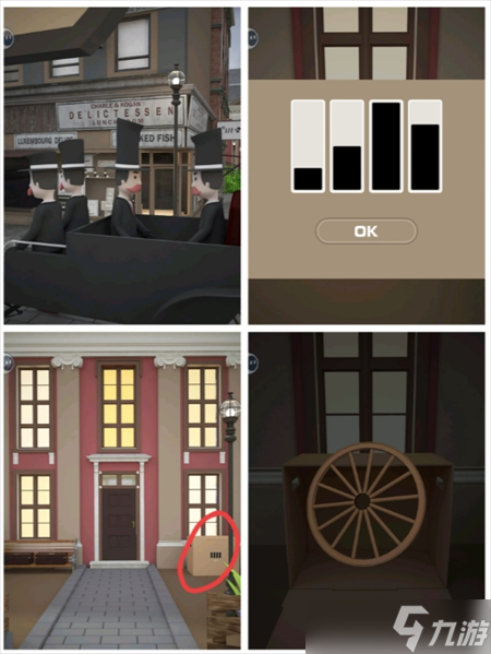 - 根据马车四人的帽子 打开花园右侧箱子 得轮子 装到马车上 得井盖提示