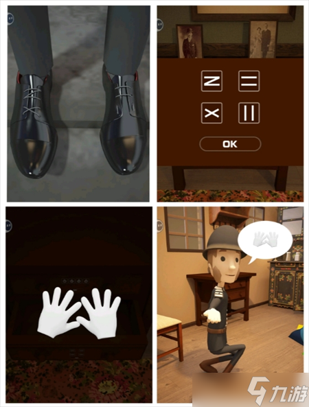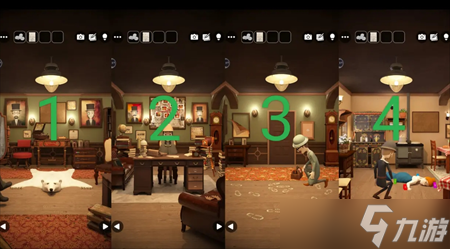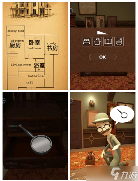 根据③图画 打开①中间抽屉 得放大镜 给③男人 得脚印提示