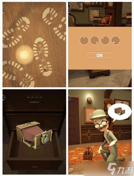 - 根据脚印提示 打开②下层抽屉 得相机 给③男人 得照片