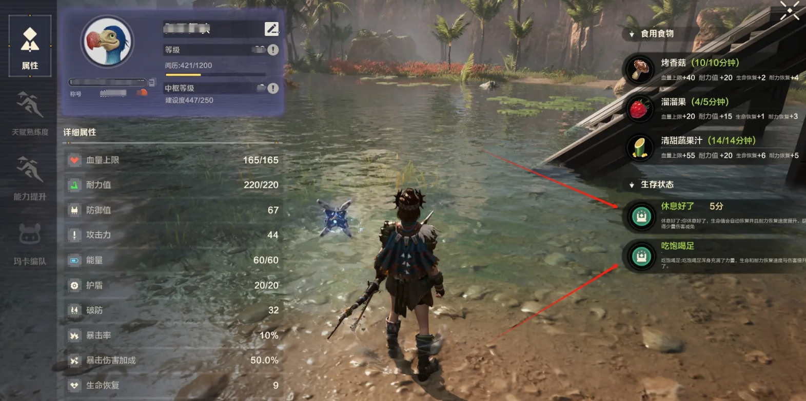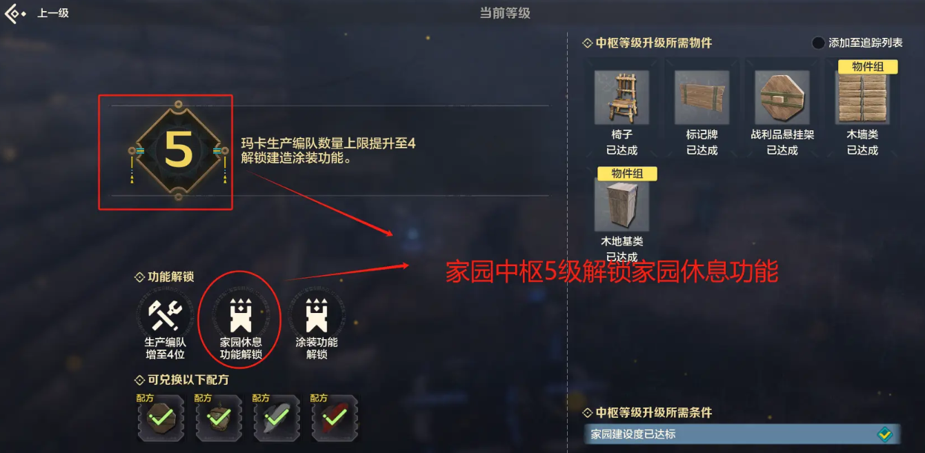 如果大家能食用经过烹饪的料理,可以维持更长时间的进食增益,所以有条件的可以先进行烹饪,最后当大家把家园升至五级时,家园还会解锁休息功能,让我们解除劳累的同时,获得五分钟自动恢复生命的增益。