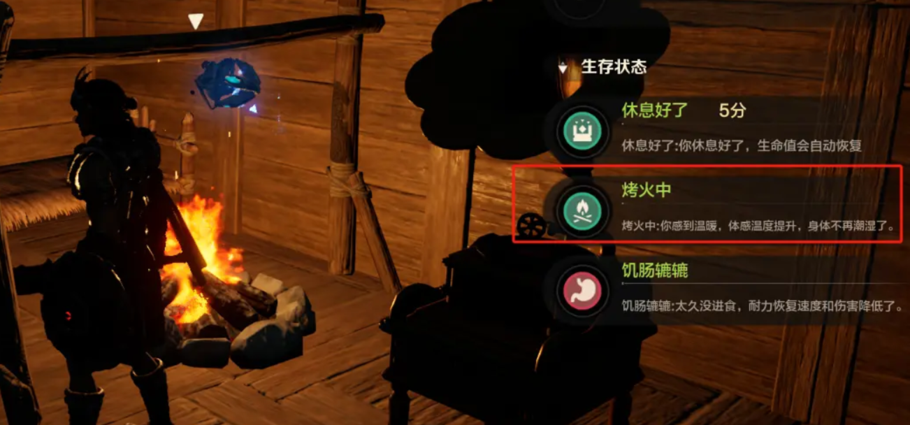 饥饿和浸水会影响到耐力的恢复和伤害,寒冷则会增加耐力的消耗并降低伤害,如果出现饥饿就表明角色太长时间没进食,这个时候我们只需食用任意的食物即可消除,寒冷和浸水可以到篝火附近点燃篝火消除,不过下雨时记得篝火要在房顶的下方才能点燃。