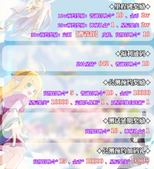 - 公测预约奖励5抽+预约加码15抽+里程碑奖励10抽+测试延期奖励10抽+福利通码10抽。