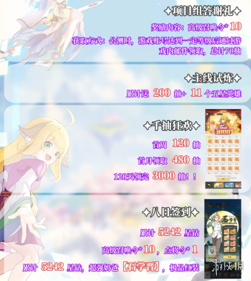 - 无门槛首日领50抽+项目组答谢礼70抽+千抽狂欢首周120抽+八日签到10抽+主线首周200抽。