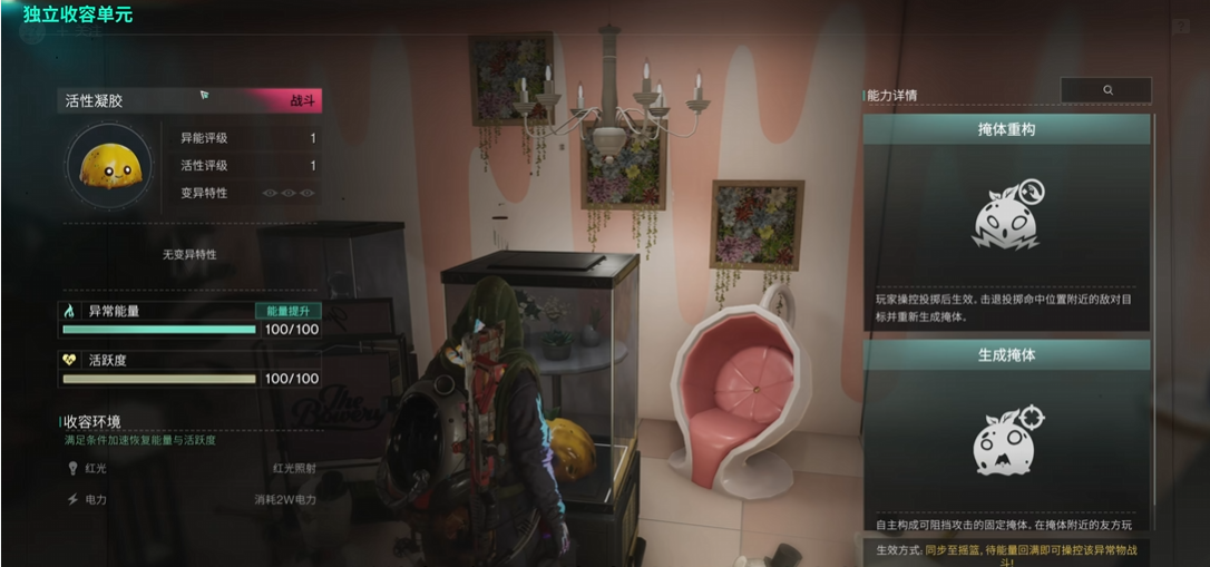 活性凝胶是战斗型的特殊防御材料,其效能随异能等级提升而增强。当它被放入收容单元后,即可释放两种能力:能力掩体构成”,能在指定区域投掷并生成保护罩,抵御敌方火力直至能量耗尽。