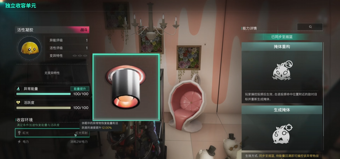 不仅要在周围布置红色光照,还需供给所需养料粘合剂橡胶箱,同时连接电源以支持的速度恢复。这是活性凝胶得以在适合的幻境中茁壮成长,并逐步达到收容能力的关键条件之一。
