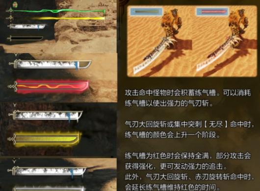 玩家攻击命中怪物时会积蓄练气槽。可消耗练气槽使用强力气刃斩。练气槽颜色上升时,将衍生出气刃斩I、II、III及大回旋斩。