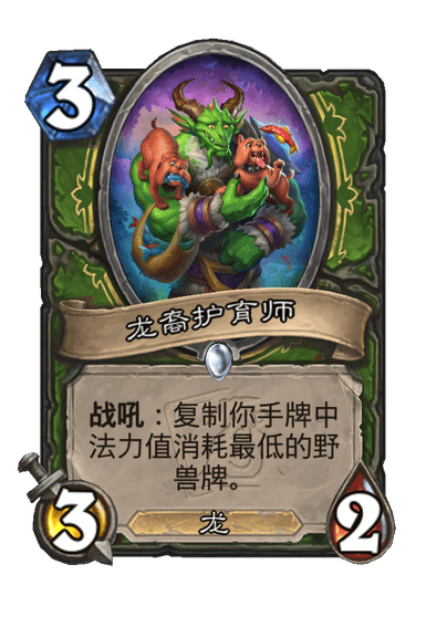 效果:战吼:复制你手牌中法力值消耗最低的野兽牌。