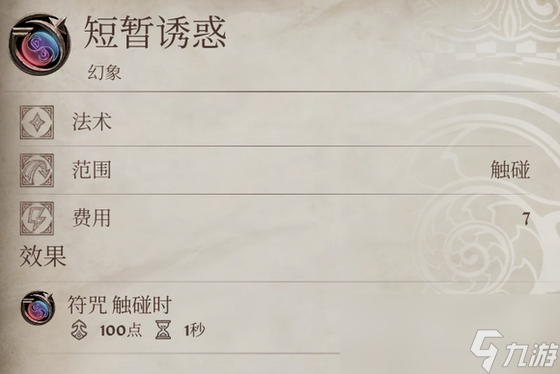 只需消耗少量的能量(且技能等级越高,法术耗蓝越少),内对NPC施加诱惑,能迅速提升其好感度至满值。需要注意的是,在对话期间时间暂停,所以利用这个法术配合立即开始的对话就能最大限度地享受满好感带来的各种优势,如与商人讨价还价、劝说NPC参与任务等场景。
