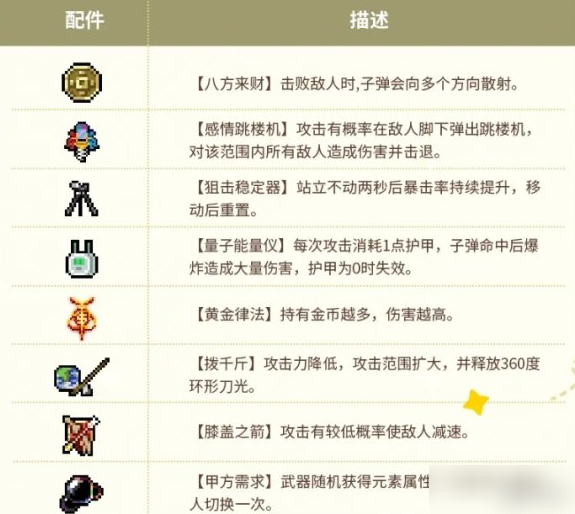- 与铁匠交互可获得配件,每把武器都可同时装配两个配件。