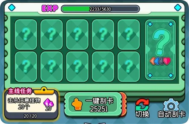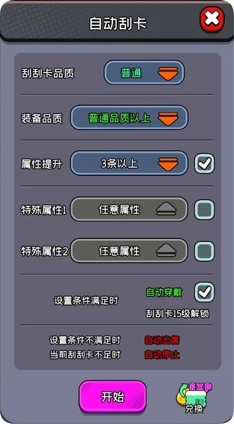 游戏的核心玩法是通过刮刮乐获取装备,装备的属性随机决定,玩家可以通过使用不同等级的刮刮卡来获得基础或进阶装备。