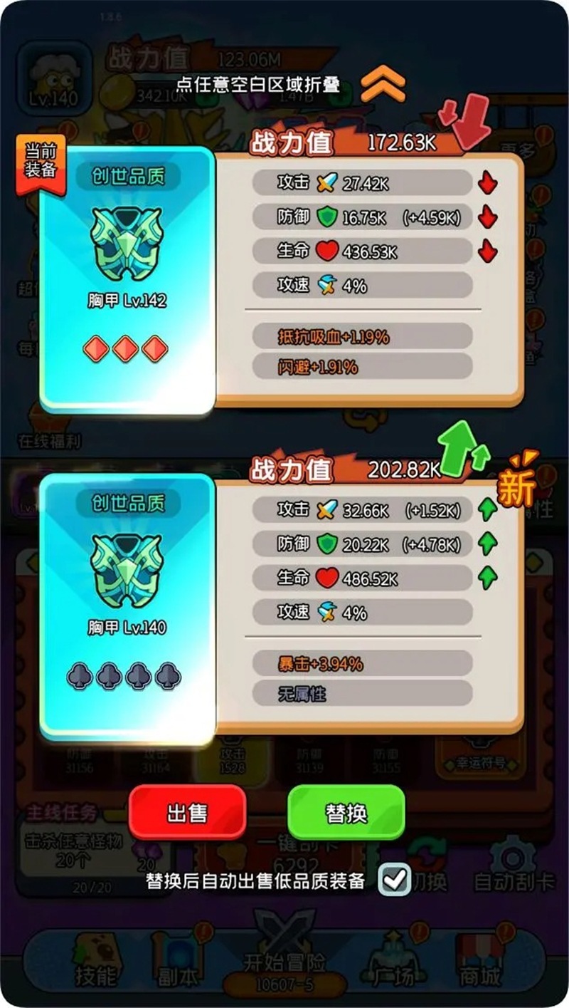 当您获得战力值更高的装备时,不用犹豫点击替换即可。