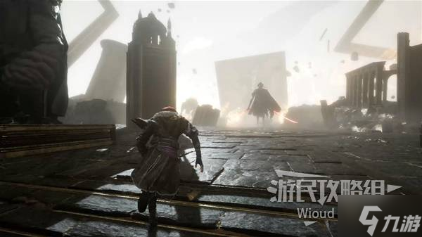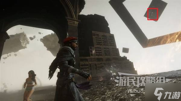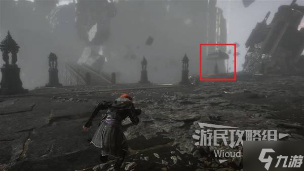 步入中央地带,左方探查,沿左侧延伸的小桥抵达终点后,攀爬右侧墙面的梯子登上顶楼,利用钩爪跃上高空平台。