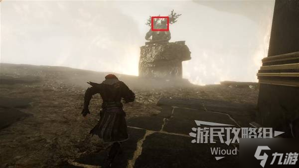 继续前行,前往下图所示的地点,通过右侧钩爪前进,收集一处道具;然后返回原地,利用绳索攀爬至高处,迎接一关神秘挑战者。