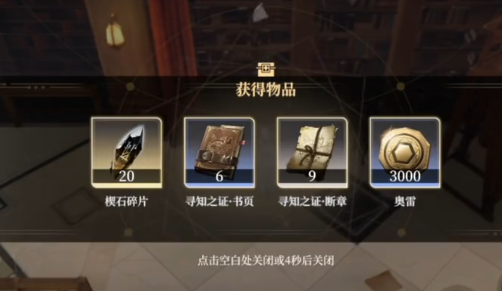 在特定场景下,你可以看到闪烁的物体,此时无法直接获取。将时钟开启后,移近就能顺利获得宝箱中的物品。这些宝箱里包含雷、知之证书页、知之证断章和楔石碎片等珍贵奖励。