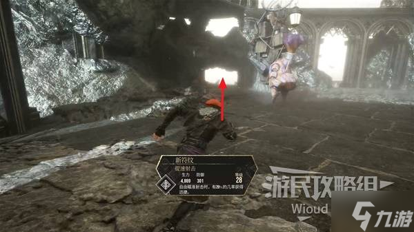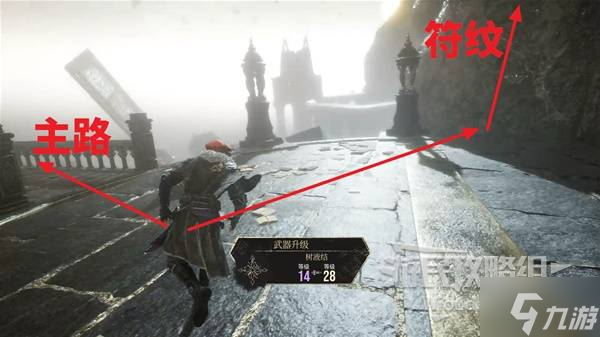 先爬右侧梯子上去,转头跳到对面有怪物的平台,可捡到符纹【助力标记】。