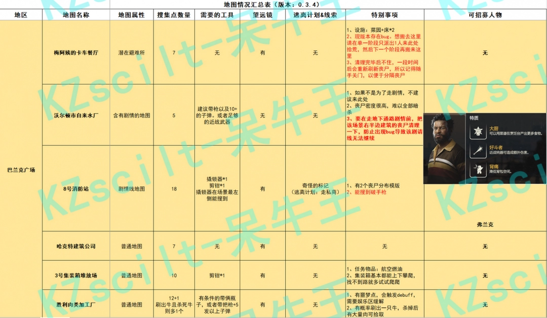 必备装备:拥有充足的资源是生存的关键。携带一把有效武器,或至少弹药可以保证你有足够的攻击手段。此外,一个可靠的近战武器也是不可或缺的。该地图充满了丧尸,而且大部分区域都是易受攻击的地方。尽管如此,这并不是适合所有玩家的游戏场所,如果你不是为了剧情目的来此,建议你避开这里。