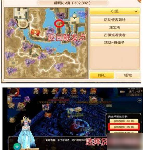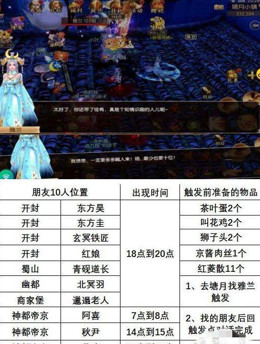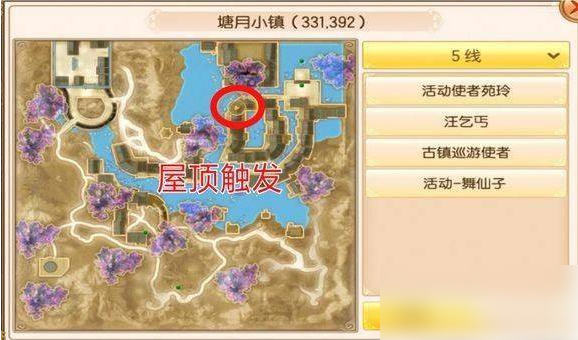 1、任务地点:塘月小镇,坐标(331.392),准备一个红菱散,具体如下图,在屋顶上方,要飞上去找到npc雅兰对话两次就可以触发,最后提示有没有多余的酒。
