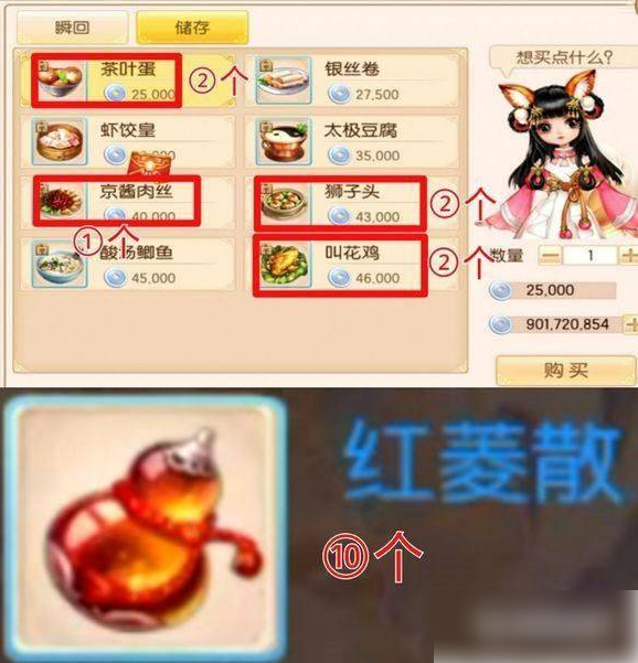 2、准备食材,除了要找到酒还需要找一些佳肴,准备2个茶叶蛋、2个狮子头、2个叫花鸡、1个京酱肉丝,还有10个红菱散,再去和雅兰进行对话,食材会被吃掉。