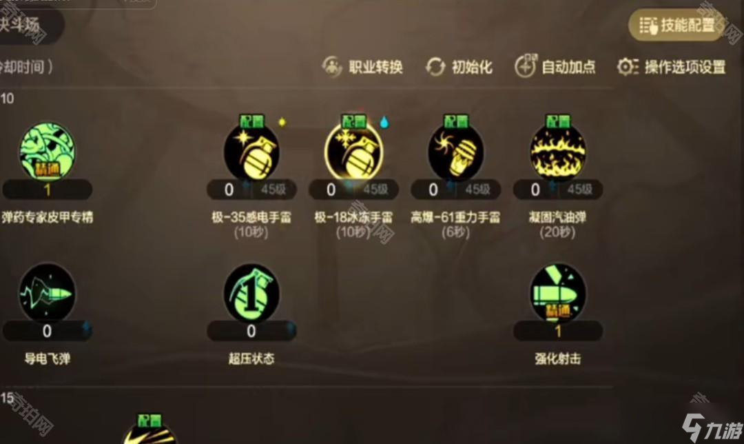 主动技能:导电飞弹:显著提升物理攻击强度(精通),超压状态:使四种手雷的装载量提升至单次最多可携带一枚(必定点)。强化射击功能:根据所选武器的不同,射击效果得到增强。