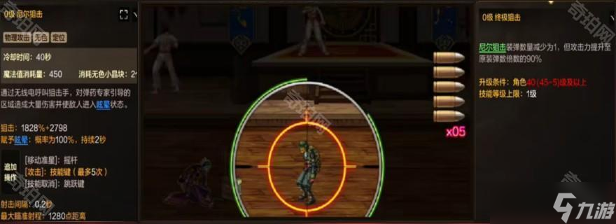 - 尼尔狙击(招牌技能,可通过被动技能终极狙击将5发子弹改为1发,但会降低10%伤害)