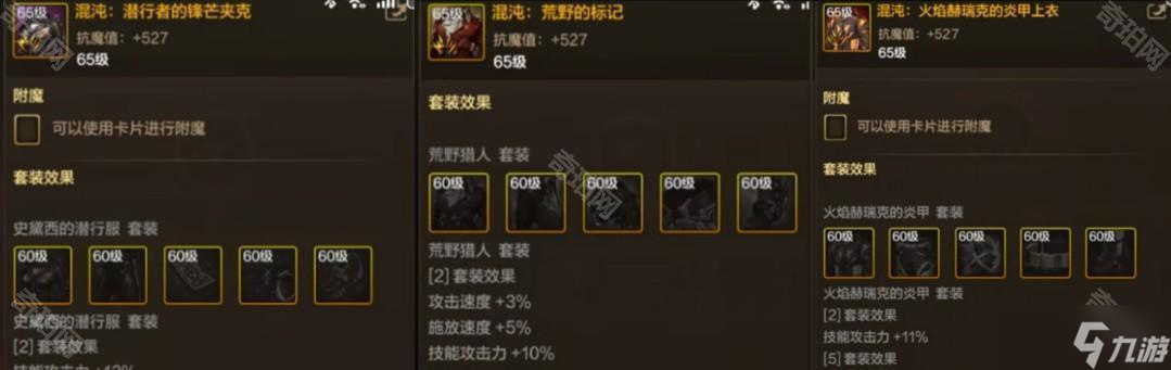 三套防御装备任你选,混沌之火龙加成全;暗杀者提高伤害与吸收;荒野标记则以高额命中和暴击取胜。