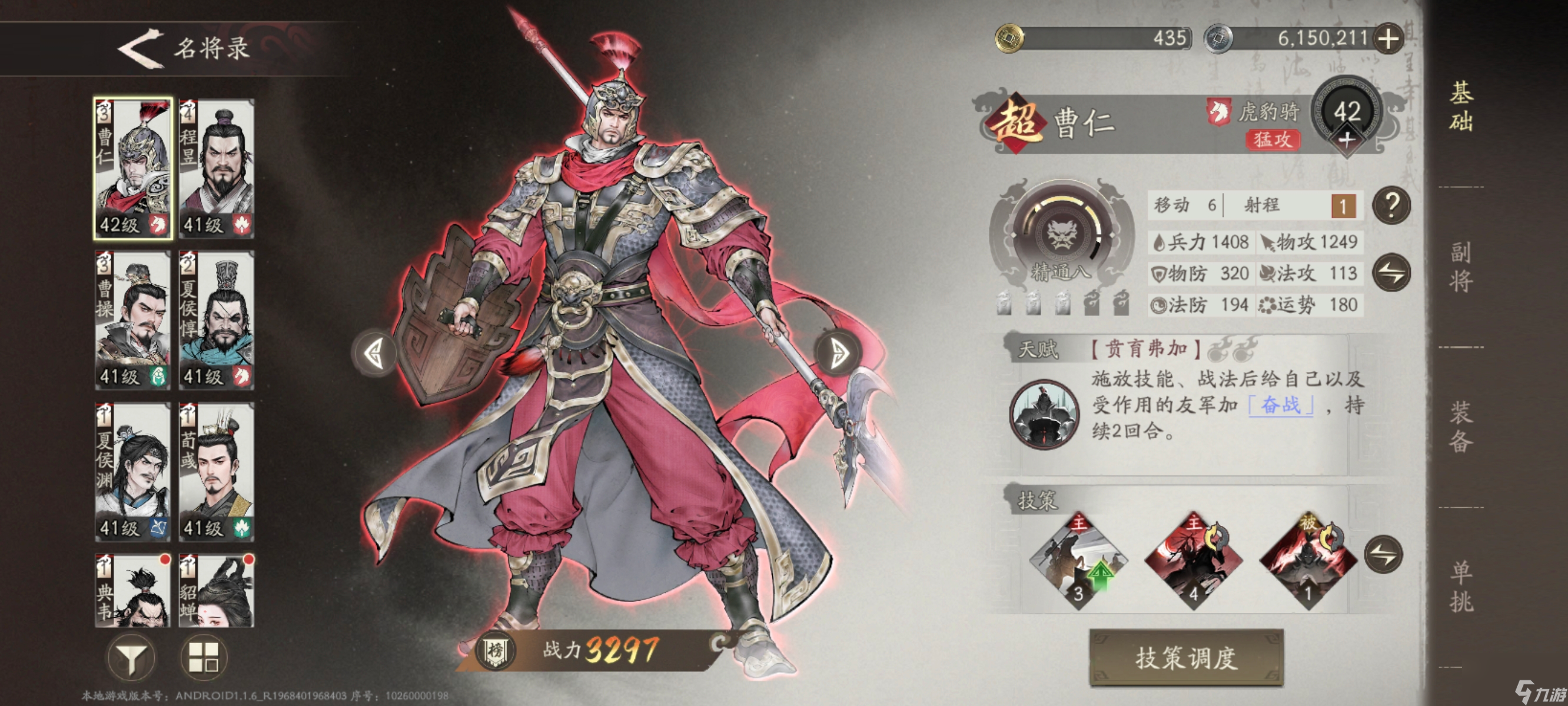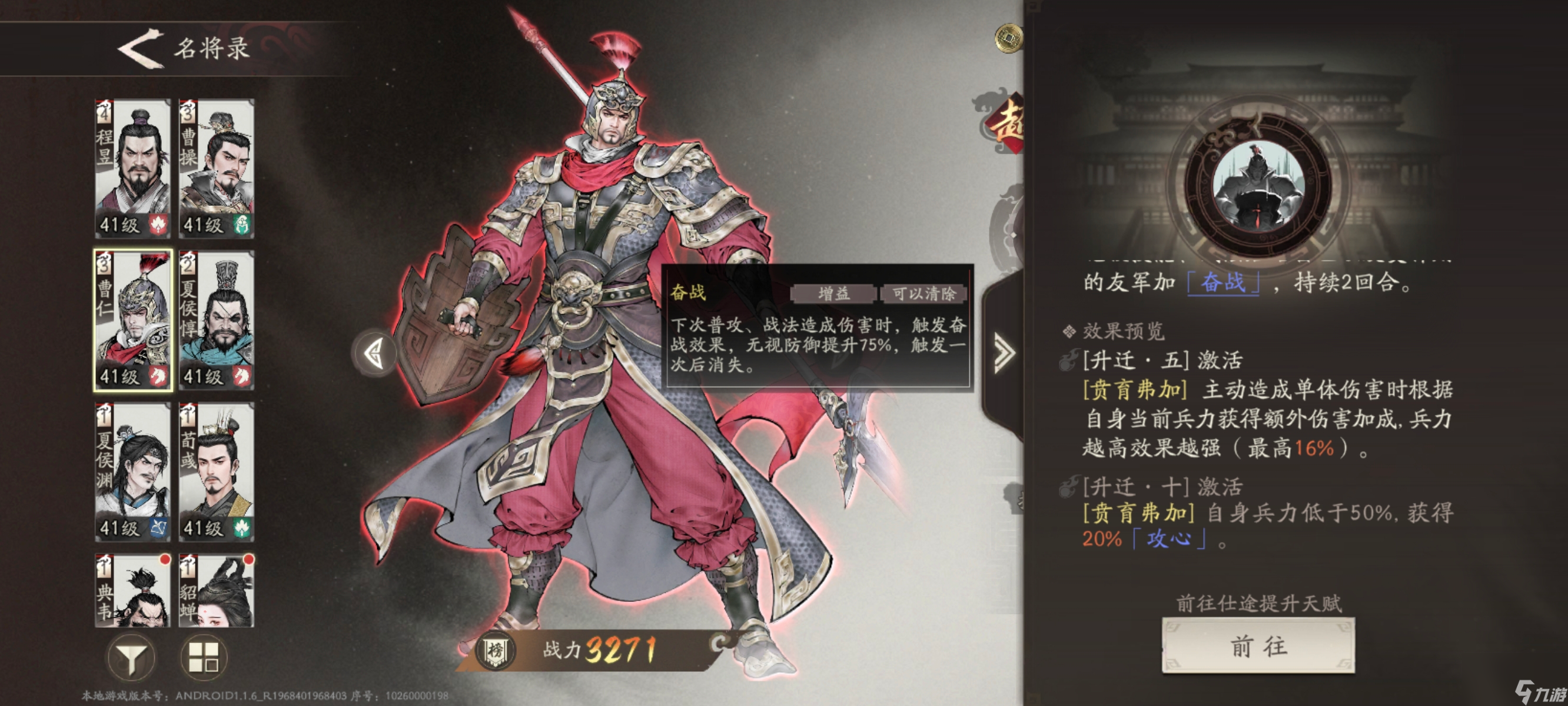 曹仁的核心特点:- 高速输出:攻击面板,实战中轻松突破害。 - 无视防御机制:天赋“奋战”提供高达的无视防御效果,配合副将提升至,让敌人防不胜防。- 超高机动性:技能“意气奋怒”和“天人之勇”能实现长驱战术,快速冲向敌人。