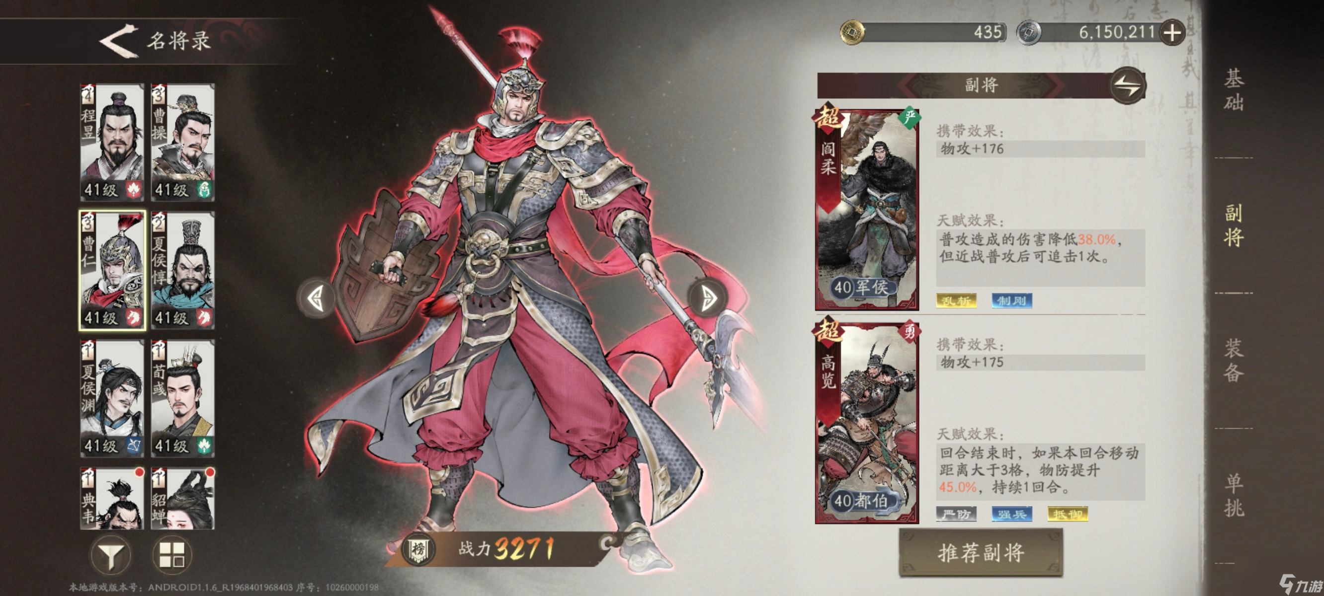 推荐副将组合:阎柔+高览。阎柔增强普攻输出,契合曹仁的核心玩法;高览增加物防,强化生存能力。