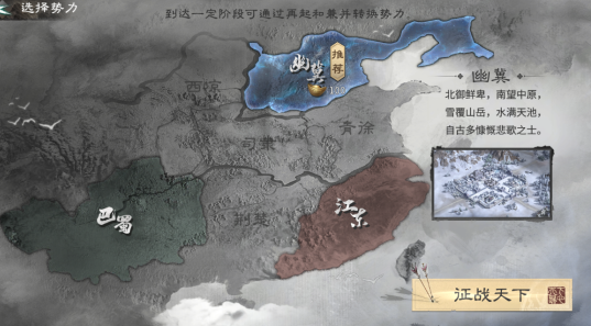 完成角色创建后,将出现一个较为简单的剧情段落。然后,大家将进入势力选择界面“落州”,这里以S季为例,有三大家族供玩家挑选:魏国的幽冀、蜀国的巴蜀以及吴国的江东。这些势力虽然看似与较核心的“司隶”相隔不远,但实际上,他们的城池布局和位置分布相差甚远。因此,你可以根据自己的喜好来选择,如果系统推荐有额外奖励的话。这不仅是获得丰厚元宝的途径,也是体验丰富策略玩法的好机会。