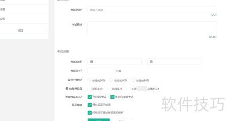 在新增考试页面中输入名称、描述、时间和分数限制,并点击保存以访问试卷设置界面。