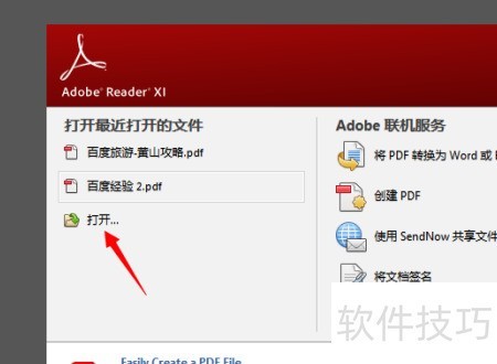 1、 启动Adobe Reader后,界面会显示空白页面,点击打开按钮,选择并加载一个PDF文件即可查看,操作所示。