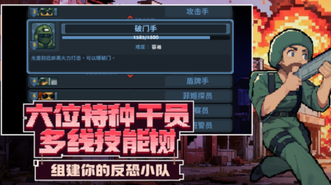 该游戏设定在一个横版战术射击场景中,玩家需操控特警小队执行高危任务。不仅要使用多种枪械与敌人交火,还要在战斗中安全解救人质。每一场任务都需精心策划走位与攻击顺序,合理运用掩体与技能,完成一系列紧张刺激的反恐行动。