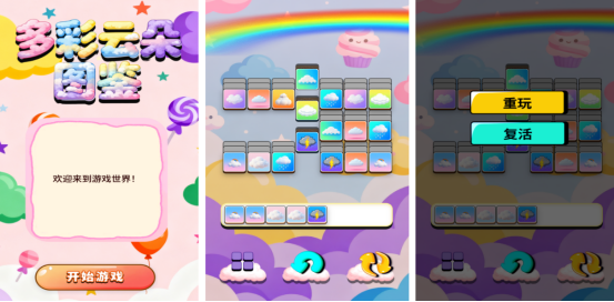 游戏中拥有丰富的关卡设计,每一关都呈现着不同的形态,如积雨云、雷暴云等。游戏开始时,各种云朵图像会层层叠放在屏幕上,下方有空白对话框等待玩家操作。通过手指滑动屏幕并观察图像,找到三个相同的云朵图案进行组合消除,完成此动作后可将之收录进个人云朵图鉴中。集齐上百种云朵图案不仅能使你的图鉴更加完善,还能帮助你在分数排行榜上取得更高的名次!