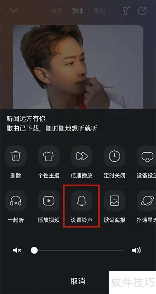 qq音乐安卓版下载 类型:视频直播 大小:184.4m 语言:简体中文 评分: 查看详情 QQ音乐设置铃声教程 在QQ音乐中选择歌曲,点击分享,找到设为铃声选项,按提示操作即可完成设置。 - 进入音乐播放界面,点击双点图标。 - 设置铃声,点击即可。 - 选中音乐片段,点击设为铃声即可完成设置。 - 进入音乐播放界面,点击双点图标。 - 点击设置铃声选项 - 选择音乐片段,点击设为铃声即可完成。