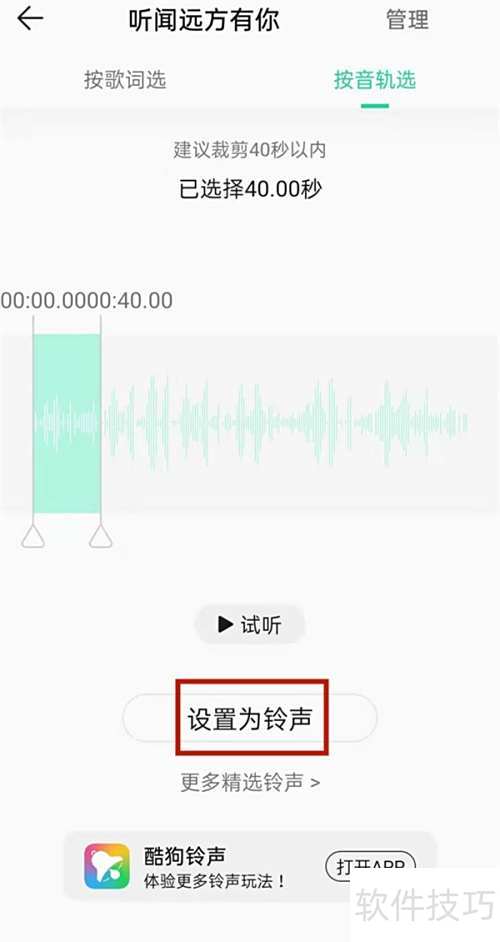QQ音乐设置铃声教程 时间:2025-11-22 qq音乐安卓版下载 类型:视频直播 大小:184.4m 语言:简体中文 评分: 查看详情 QQ音乐设置铃声教程 在QQ音乐中选择歌曲,点击分享,找到设为铃声选项,按提示操作即可完成设置。 - 进入音乐播放界面,点击双点图标。 - 设置铃声,点击即可。 - 选中音乐片段,点击设为铃声即可完成设置。 - 进入音乐播放界面,点击双点图标。 - 点击设置铃声选项 - 选择音乐片段,点击设为铃声即可完成。