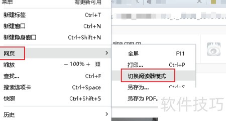 - 在菜单中选择网页,再点击子菜单的切换阅读器模式。
