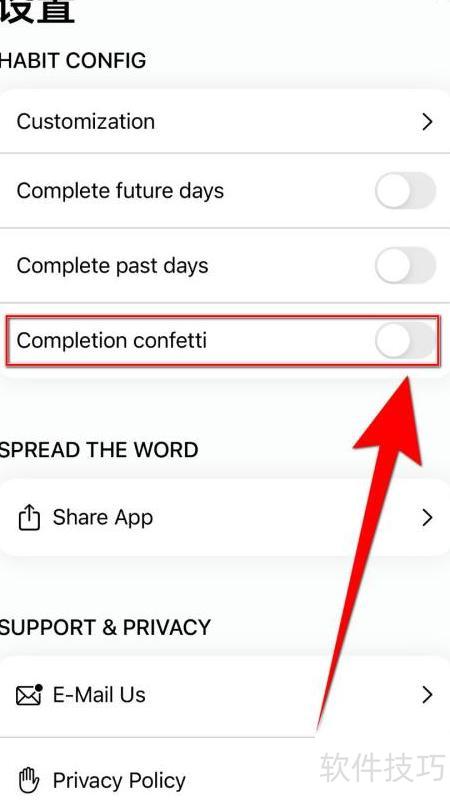 - 当Completion confetti后面的圆点变成灰色时,表示Habit Tracker已成功关闭完成庆祝效果。