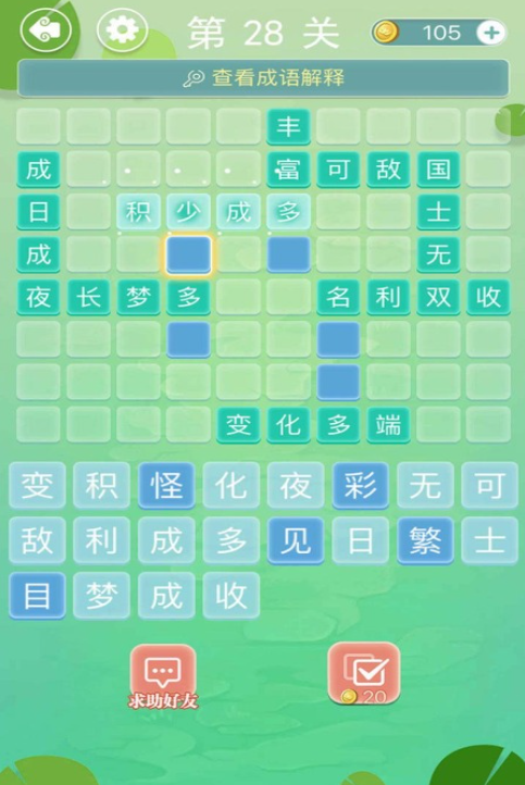 本作以古代诗词与常用成语为核心素材,设计出丰富有趣的挑战关卡。每一关都会展示不完整的诗句或成语片段,玩家需根据提示填写正确汉字,还原原句方可通关。这种沉浸式的学习方式有助于强化记忆,长期游玩可显著提升语文储备,为日常学习和考试打下坚实基础。