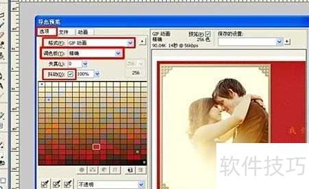 在设置中选择GIF格式并调节调色板至精确,勾选抖动后,点击导出按钮即可完成此步骤。