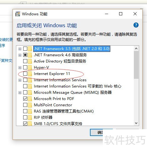 - 在弹出的窗口中取消勾选 Internet Explorer 11(版本号以实际为准)即可。