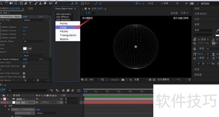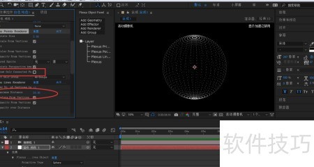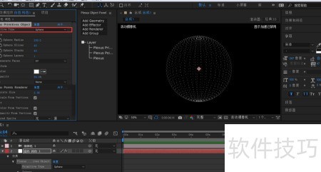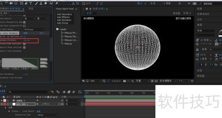 - 此时观察AE画面中的球体,可见各点间连线密集,适当减小Maximum Distance参数即可优化显示效果。