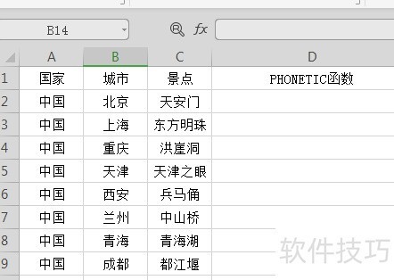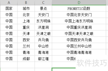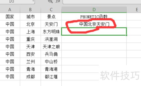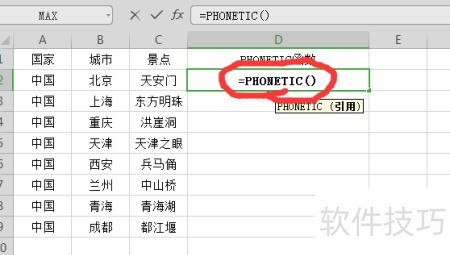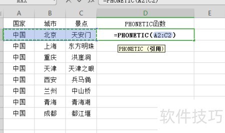 - 选中D2单元格,输入=PHONETIC函数,操作所示。