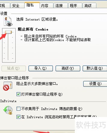 通过鼠标移动滑块调整阻止Cookies的力度,一般默认设置为中等,但有些人喜欢完全阻止所有Cookie,这可能会影响部分网站(如淘宝、百度)的正常访问,包括账号无法登录甚至提示输入错误信息时。这时只需将滑块稍微向下移动几个步骤,允许部分Cookies即可解决上述问题,并兼顾隐私保护和使用便利性。