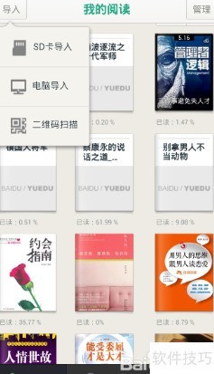 点击左上角的导入按钮,从下拉菜单中选择SD卡导入选项,以便导入手机电子书。
