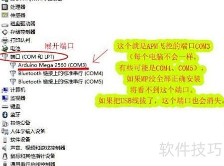 在设备管理器中展开端口选项,若成功安装Arduino Mega 动,会显示对应的端口;未正确安装则不会出现。请记录下该端口号(如COM,以便后续通过MP连接APM时使用此信息进行配置与通信。