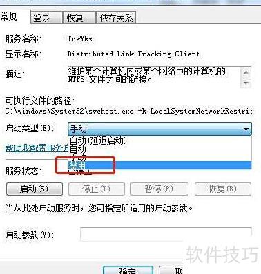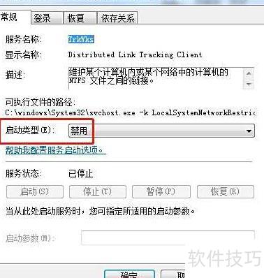 在Win7系统中,通过运行services.msc找到Distributed Link Tracking Client,右键选择属性,将启动类型改为禁用并停止服务即可。