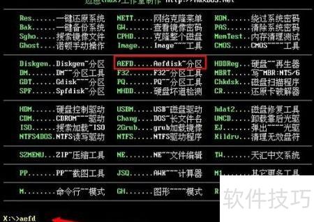 - 在MAXDOS工具箱的界面中,键入aefd并按回车,即可启动aefdisk分区工具,操作界面所示。