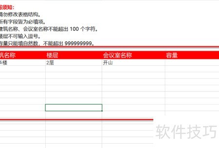 - 根据要求,我们在表格中填写会议室的相关信息字段。
