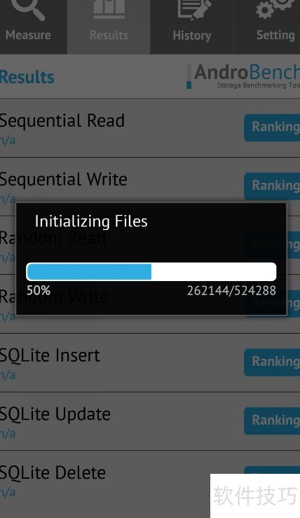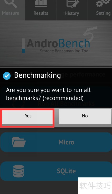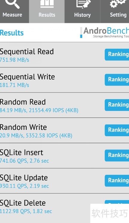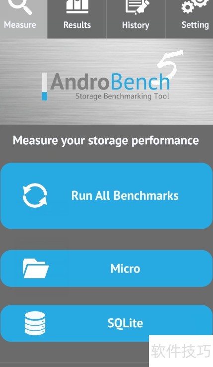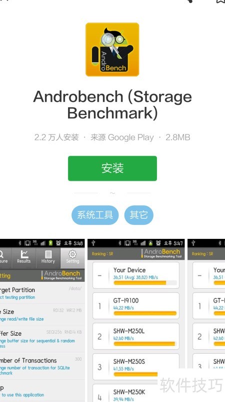 搜索并安装最新版AndroBench于各大应用商店,用于测试安卓手机闪存性能,无需付费。
